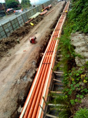 項目介紹:本項目為市重點工程,公招項目。時間緊(合同開工時間為2016年7月28日,合同竣工時間為2016年9月15日),任務重(需新建電纜通道K18約403米,K12約37米,K6約1294米,電力井54座,敷設電纜約4966米),施工難度大(全線為鬧市區,新建電纜通道需開挖公路及人行道,地下管網復雜,協調難度大)。需要通宵達旦,夜以繼日的趕工。受到了建設單位:“重慶市國際化中央商務區彈子石示范區開發建設管理委員會”的高度評價和肯定,獲得了良好的社會效益。