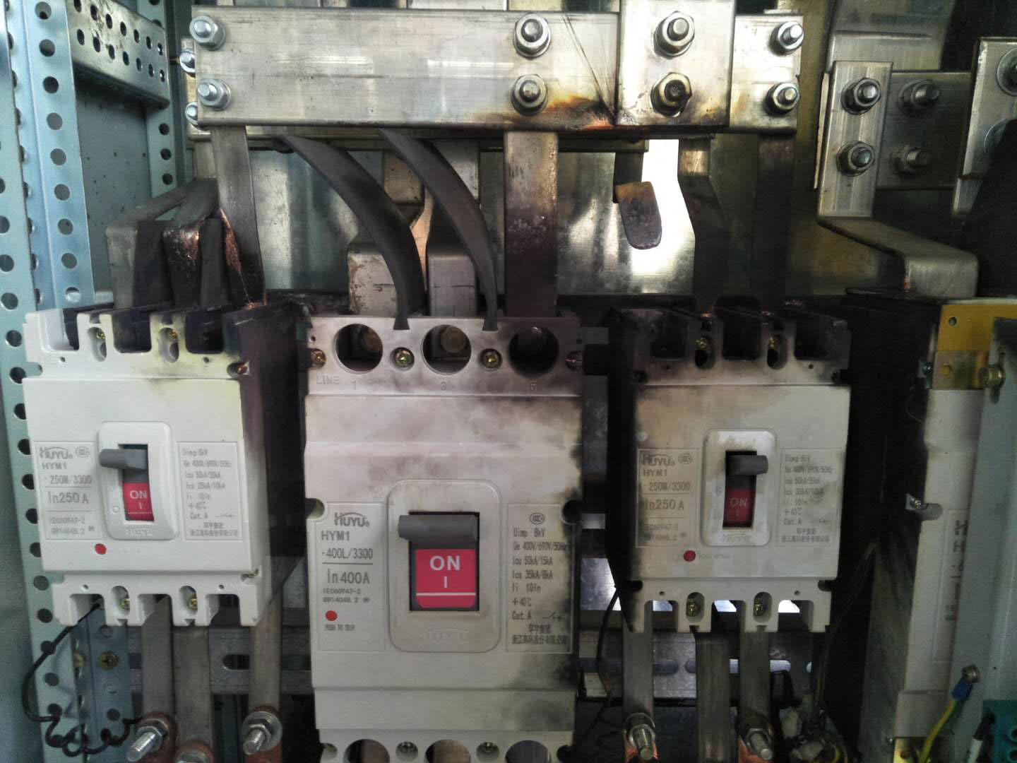 故障原因:塑殼斷路器進線端螺絲未緊固,橫聯(lián)母排螺絲松動,低壓缺相
