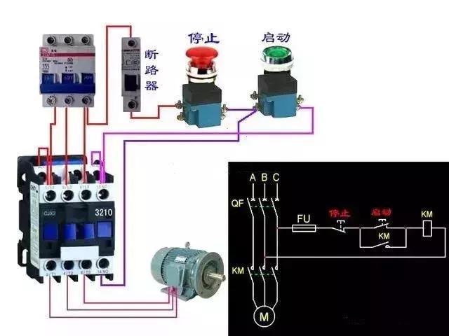 明白了實(shí)物接線以后我們?cè)倏措娐穲D就很容易理解了,右方是接觸器自鎖電路圖,ABC分別電表三相火線電源,QF開關(guān),KM是接觸器,F(xiàn)U是熔斷器,KM帶個(gè)方口就是接觸器線圈電源,按鈕的位置,連在一起的是要接常閉,分開的是要接常開,圓圈M 是負(fù)載電動(dòng)機(jī),根據(jù)實(shí)物接線圖再結(jié)合自鎖電路圖!