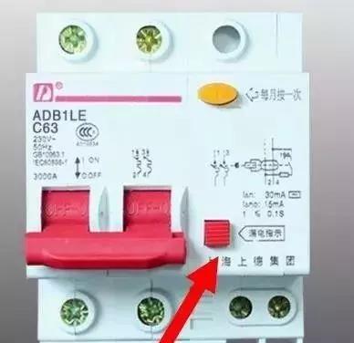 看一下紅箭頭對應的位置:漏電指示,如果漏電跳閘,這個地方正常情況下會凸出來,高于平面,必須按下去才能再次合閘。