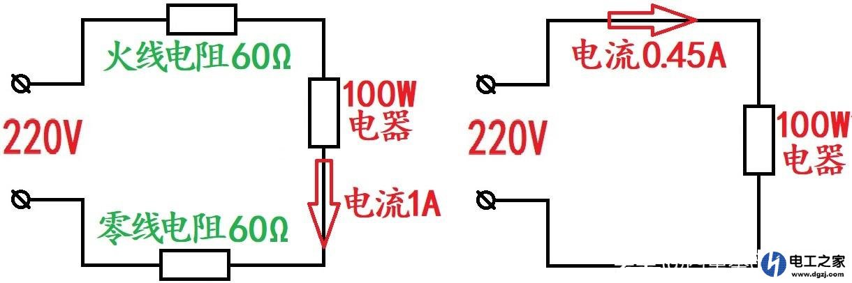 但這時100W電器的實際功耗也變成了220 W,既火線零線各60W加電器本身的100W,這就造成了供電線路加長后電流不減反增的反?,F(xiàn)象。