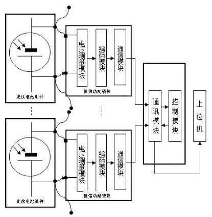 所述故障檢測模塊包括通信模塊和控制模塊;所述通信模塊的輸入端與所述組件通信模塊的輸出端連接;所述通信模塊的輸出端與所述控制模塊的輸入端連接;所述控制模塊的輸出端與所述通信模塊的輸入端連接;用于接收所述信息傳輸模塊的參數(shù)信息,送入所述控制模塊進行故障檢測,判斷是否出現(xiàn)故障,再將檢測結(jié)果送到所述通信模塊,所述通信模塊的輸出端與上位機連接,用于將故障檢測結(jié)果由所述通信模塊傳送至上位機,所述上位機用于實時顯示光伏電池組件的運行狀態(tài)。