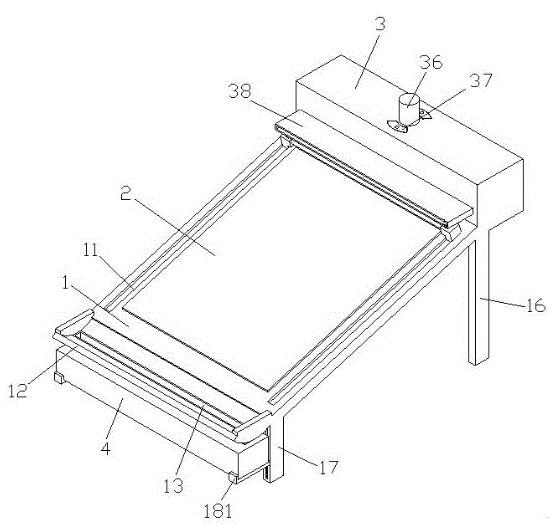 所述連接臂一端設有安裝塊,所述安裝塊上設有第三連接槽,所述收集箱側壁上設有與所述第三連接槽相配合的第一連接塊,所述第一連接塊上設有支撐板,所述第三連接槽內設有與所述支撐板相配合的第二支撐塊,所述第三連接槽內壁上設有第三滑塊,所述第一連接塊側壁上設有與所述第三滑塊相配合的第一滑槽;所述第三連接槽內壁上還設有第四活動槽,所述第四活動槽內設有與所述支撐板相配合的限位板;在對收集箱做安裝時,將第一連接塊放入到第三連接槽內,支撐板置于第二支撐塊上,第二支撐塊為支撐板提供支撐力,將第一連接塊安裝于指定第三連接槽的指定位置上,第一滑槽與第三滑塊相配合,避免第一連接塊在水平方向上從第三連接槽內移出,使收集箱可正常隨連接臂進行轉動;第一連接塊裝入到第三連接槽內后,將限位板從第四活動槽內推出,限位板進入到第三活動槽內,限位板置于第一安裝板頂部,在限位板作用下對第一連接塊起固定作用,將第一連接塊固定在第三連接槽內,保證收集箱與連接臂連接的可靠性。