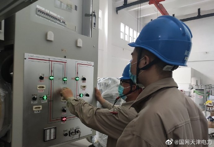 5月25日,天津送變電員工秦勤、郭志君在交流220千伏海河下游變電站傳動110kV分段開關,確保設備正常運行。 ????