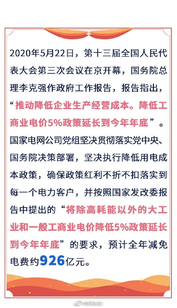 2016~2019年歷年政策疊加,國(guó)家電網(wǎng)經(jīng)營(yíng)區(qū)終端用戶電費(fèi)負(fù)擔(dān)年減輕約3008億元。2020年,為應(yīng)對(duì)新冠肺炎疫情對(duì)經(jīng)濟(jì)造成的沖擊,國(guó)家電網(wǎng)公司堅(jiān)決執(zhí)行階段性降低用電成本政策,預(yù)計(jì)全年減免電費(fèi)約926億元。 ????