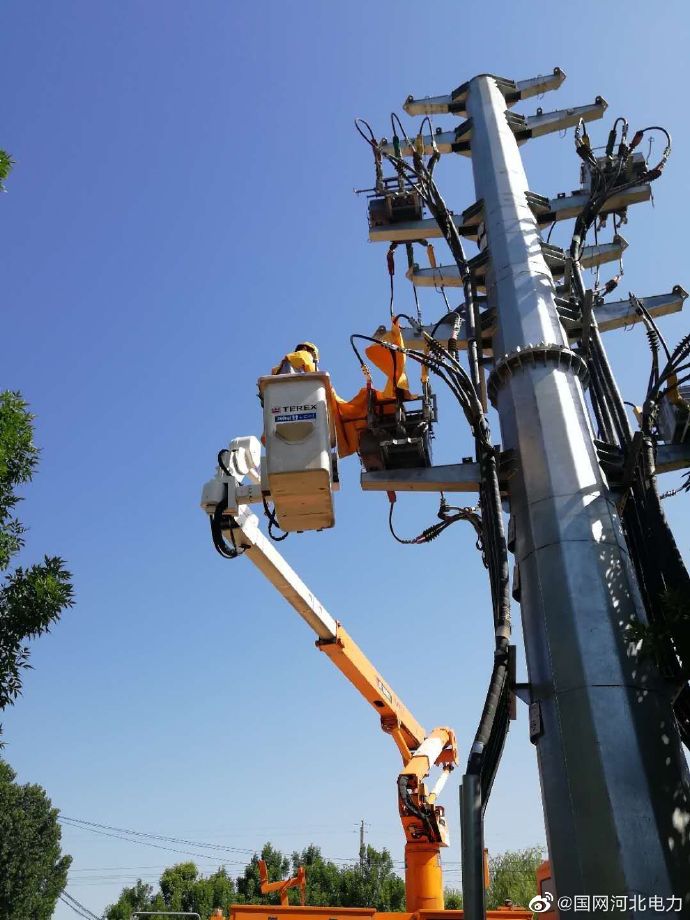 帶電作業“小黃人”,欲與天公試比高;消缺除患“神通顯”,揮灑汗水保供電。國網定州市供電公司堅持“能帶電不停電”的理念,大力推進配網不停電作業,用實際行動,力保一方客戶無憂用電。圖為5月28日,帶電作業班處理叮嚀店所區域雙天機械572線路缺陷。