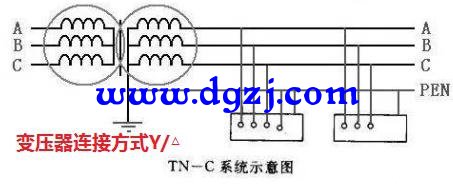 一般在低壓配電線路中都采用的是四根導(dǎo)線進(jìn)行傳輸?shù)摹T诟邏?0KV降到低壓380V的過程中所用的變壓器,它的一次繞組的連接形式是三角形的連接方式,變壓器的二次繞組所采用的連接方式是星形連接方式,如下面的示意圖所示。這樣以來從變壓器中性點引出的導(dǎo)線我們叫它工作零線,從變壓器次級繞組上引出的線叫火線。