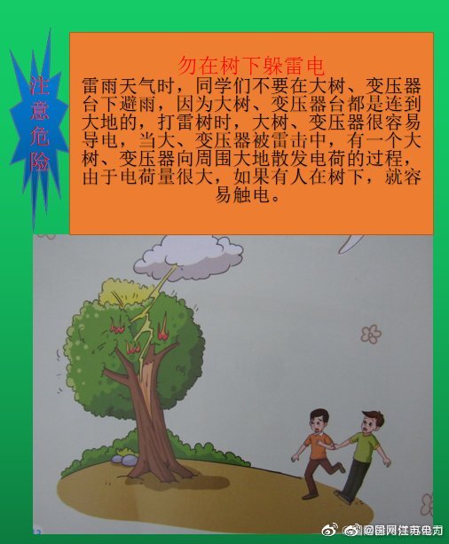 雷雨天氣時,不要在大樹、變壓器臺下避雨,因為大樹、變壓器臺都是連到大地的,打雷時,大樹、變壓器很容易導電,當大樹、變壓器被雷擊中,有一個大樹、變壓器向周圍大地散發電荷的過程,由于電荷量很大,如果有人在樹下,就容易觸電。切記勿在樹下躲雷電危險。
