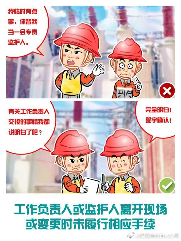 【電力施工安全反違章——工作負責人、專責監護人離開工作現場或變更時未履行相應手續】專責監護人需長時間離開工作現場時,應由工作負責人變更專責監護人,履行變更手續,并告知全體被監護人員。工作期間,工作負責人若需暫時離開工作現場,應指定能勝任的人員臨時代替,離開前應將工作現場交待清楚,并告知全體工作班成員。原工作負責人返回工作現場時,也應履行同樣的交接手續。工作負責人若需長時間離開工作現場時,應由原工作票簽發人變更工作負責人,履行變更手續,并告知全體工作班成員及所有工作許可人。原、現工作負責人應履行必要的交接手續,并在工作票上簽名確認。