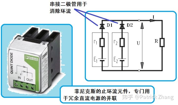 在實用中,為了避免環流,兩只電壓源并聯時必須在正極串聯二極管來消除環流。見下圖: