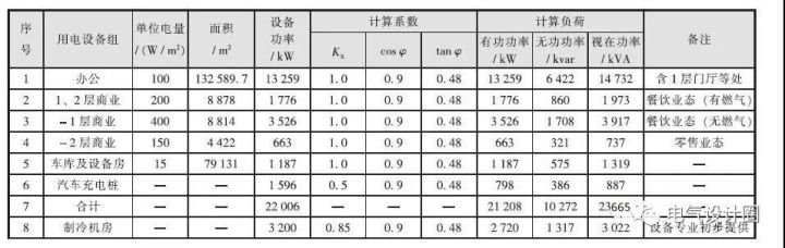 在方案設計(初設)階段,按負荷密度指標法進行負荷計算,過程并不復雜,需注意的是,本項目設置了電動汽車充電樁,而常規的汽車庫用電指標8 ~ 15 W / m2并沒有包含充電樁負荷。北京市對辦公建筑的電動汽車充電樁配置要求為總停車位數量的25 %,慢充、快充的配建比例為5 ∶ 1 ~ 10 ∶ 1之間,本項目取9 ∶ 1。一般情況下,快充充電樁用電指標為30 kW / 臺,慢充充電樁用電指標為7 kW / 臺,用電負荷折算到變壓器時,需要系數取0. 3 ~ 0. 7,本工程取0. 5,總停車位數量 1 373個,于是可計算充電樁總裝機負荷為:1 373 × 25 % ×(0. 9 × 7 + 0. 1 × 30)= 1 596 kW。表1為方案設計階段的負荷計算表。