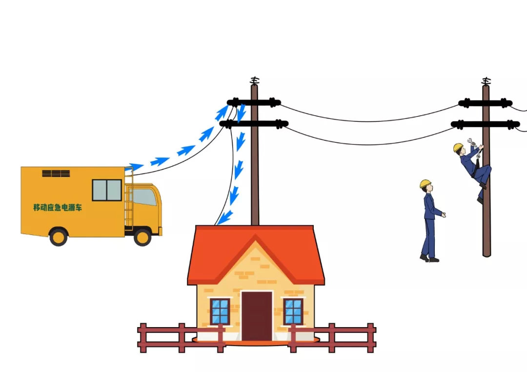 當小e家的電源A線路需要停電檢修,卻還沒有實現“手拉手”供電時,一輛移動電源車會開到附近,臨時充當“B線路”角色為小e的家供電。