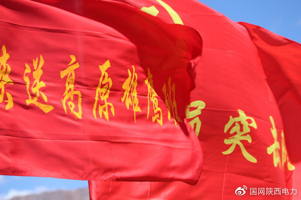 陜西送變電現場向黨員突擊隊授旗:攻堅克難,不辱使命。向青年突擊隊授旗:黨員引領,齊頭并進。洛桑達娃向堅守在高原的施工班組授受“陜送高原雄鷹班”的旗幟:陜送雄鷹,高原展翅。