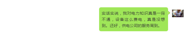 實話實說,我對電力知識真是一竅不通,設備這么費電,真是沒想到。還好,供電公司的服務周到。