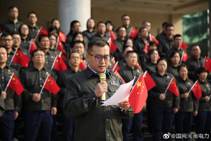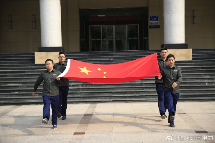 【“壯麗70年·奮斗新時代”升國旗迎國慶】9月27日,在新中國成立70周年即將到來之際,國網新鄭市供電公司百余名干部職工在公司樓前開展“壯麗70年·奮斗新時代”升國旗迎國慶活動。在嘹亮的國歌聲中,鮮艷的五星紅旗冉冉升起,大家懷著崇敬和激動的心情面向國旗行注目禮。最后,在一首《我和我的祖國》的合唱中,祝愿祖國更加繁榮昌盛、和諧富強。