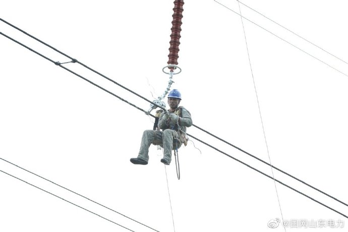10月29日,在山東威海文登區九里水頭附近,國網威海供電公司輸電運檢人員高空作業,對220千伏昆文線77號塔至78號塔之間破股導線進行修復,保障重要輸電通道安全,220千伏昆文線是220千伏文登站送入線路,為文登東部工業區提供可靠的電力支撐。 ????