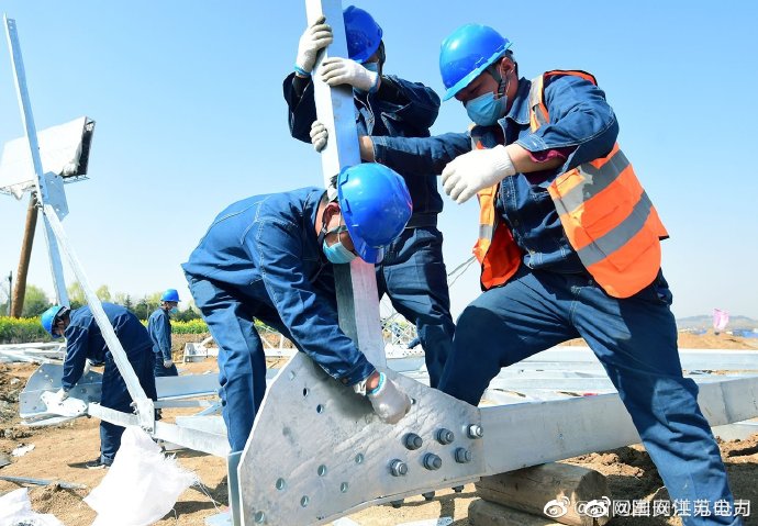 【加快電力項目建設】3月20日上午,國網淮安盱眙縣供電公司員工在盱城鎮新灣村組立35千伏鐵塔,加快推進盱眙縣政府2020年重點項目建設,加快居民安置小區、房地產開發以及政府招商引資電力項目建設進度,助力房地產開發企業復工復產,切實履行央企社會職能。