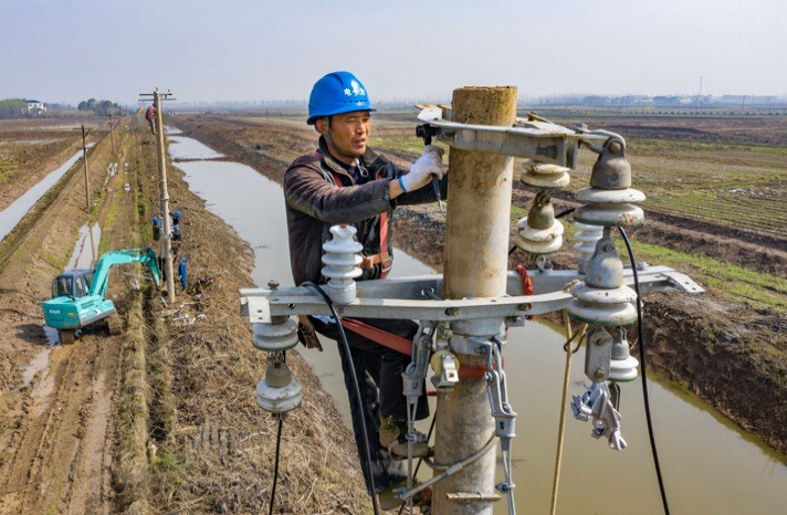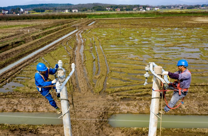 2020年3月25日,在銅陵市普濟圩現代農業集團稻蝦養殖基地,農戶正在為稻蝦田潑灑肥水,在這一片五萬畝農田里,春耕備耕正在抓緊進行。在這片生機盎然的綠色農業背后,一排沿著田間溝壑的電桿正在架設,它們將為這片希望的田野提供堅強可靠的電力灌溉,助力綠色農業產業升級。