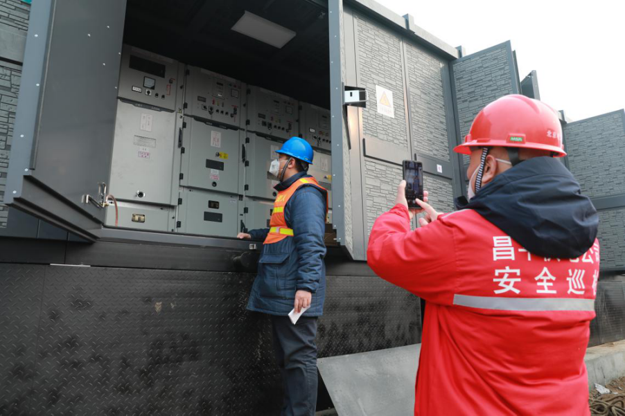 國網北京昌平供電公司安全巡檢人員對北京小湯山醫院箱變進行巡視檢查。(閔政君)