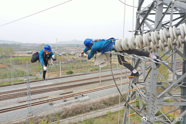 【掛線操作 勒出三塊“腹肌”】4月14日,國網日照供電公司工作人員在110千伏傅巨牽線配鐵路部門巨峰牽引站檢修。工作人員趴在距離地面25米的導線上進行分流補強工作,導線橫向1米的晃動幅度和單相導線20分鐘的工作時長,是對工作人員體力和技術的嚴峻考驗。一基鐵塔1個小時的“掛線操作”完成后,工作人員腹部勒出了三塊“腹肌”。