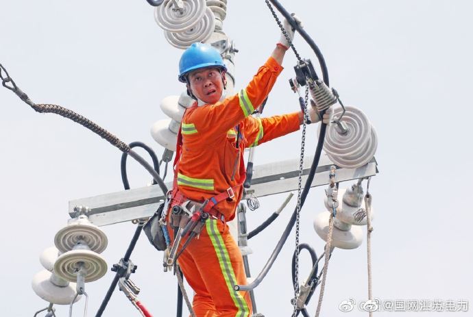 5月26日,囯網東臺市供電公司電力施工人員在富安鎮何莊村改造10千伏富陳線139一1號桿以下線路,提高供電質量和能力,保障可靠用電度夏峰。 ????