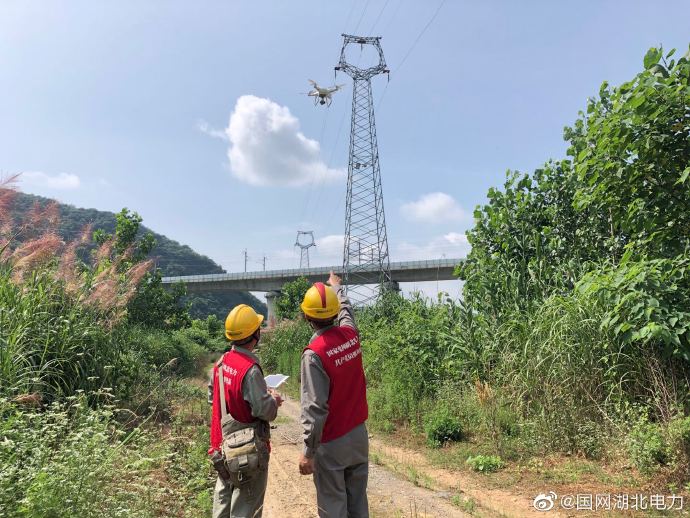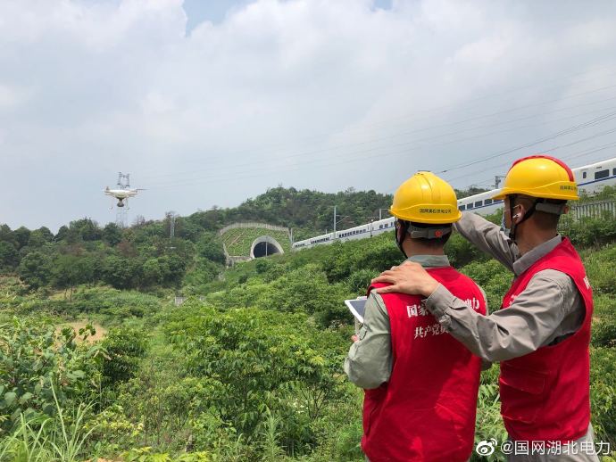 6月2日,在位于湖北黃石市陽新楓林鎮西河村的武九高鐵高架橋下,國網黃石供電公司輸電運維人員趁著晴好天氣,操作著無人機認真檢查著110千伏寶坡線061號至062跨越武九高鐵桿塔導地線、金具連接,保障迎峰度夏期間高鐵線路安全運行。