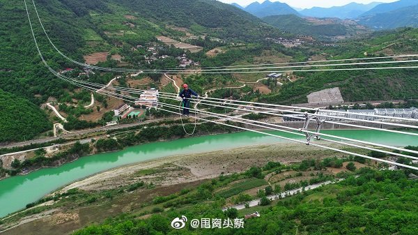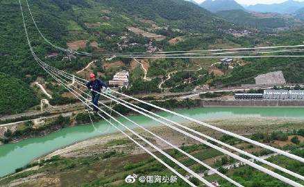 #央企復工者聯盟#?【看呆了電力工人飛躍嘉陵江,高空走鋼絲】隨著青海—河南±800千伏特高壓直流輸電線路工程陜西段貫通,這條綠色“空中走廊”實現全線貫通。6月14日,該工程陜I標段進入自檢驗收階段。陜I標段線路全長64千米,共架設鐵塔102基,80%的鐵塔位于高山大嶺、20%位于一般山地,其中35號~37號鐵塔跨越寶成鐵路和嘉陵江,檔距長度達1259米,是該標段跨越難度最大的一段