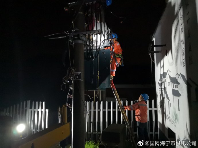 6月27日深夜10點多,在海寧市鹽官鎮萬壽村陳家木橋,3盞應急燈光束的匯聚下,國網海寧市供電公司鹽官供電所的搶修隊員還在緊張地進行變壓器固定和接線工作。夜深了,本來里三層外三層前來督戰的村民在得到“今夜可以通上電”的滿意答復后已陸續散去。