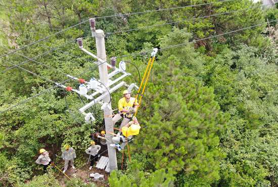 6月28日,9米電桿之上,近3米長、4公斤重的絕緣操作桿,被穿著黃色絕緣服的兩名帶電作業人員人手一根穩穩持住,這次帶電作業在10千伏天湖線展開。由于該線路所處位置為山林,道路狹窄,林木茂盛,絕緣斗臂車無法進入,而停電作業又會影響周邊居民用電。@國網玉環市供電公司?在經過前期細致查勘后,采取應用較少的絕緣桿操作法,帶電作業人員做好安全措施,兩兩一組上桿,在現場安全監護、地面作業人員的緊密配合下,有條不紊操作,歷時3小時,順利完成線路帶電搭接,確保了近10臺變壓器、2000多用戶的可靠供電