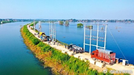 8月18日,在廬江縣同大鎮白石天河古圩段圩堤上,國網廬江縣供電公司黨員突擊隊正在進行立桿、架線、安裝配變設備,為石大圩、牛廣圩排水提供電力保障。