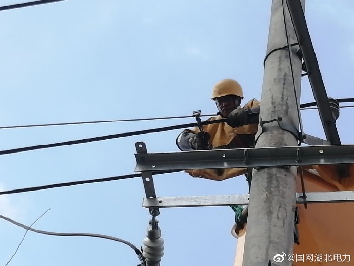 一份責任,一份擔當,為企業有序生產保駕護航,8月23日,國網咸寧供電公司帶電作業人員趕在太陽升起之前來到10kV小欖線(孫34)光明支線54號桿,作業人員身穿絕緣服、手戴絕緣手套,使用絕緣斗臂車進行帶電作業接火,全力保障企業用電。(鄭夏發) ????