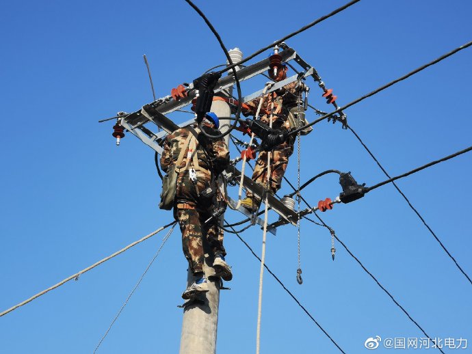 秋高氣爽碧空藍(lán),辛勤作業(yè)登高桿,齊心協(xié)力架線忙,電網(wǎng)升級(jí)保供電。10月15日,國(guó)網(wǎng)定州市供電公司工作人員,在10千伏堯方頭561線路升級(jí)電網(wǎng)、立桿架線,提升電網(wǎng)運(yùn)行水平,全力保障客戶安全可靠供電。(張鵬飛 邸樹(shù)成) ????