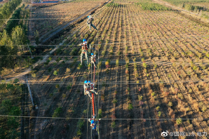 【走在藍天上的空中舞者】11月10日,國網(wǎng)墾利區(qū)供電公司工作人員在110千伏坨東線30號和31號鐵塔輸電線路上安裝相間間隔棒。共在110千伏坨東線和雙勝線上安裝間隔棒44支,防止冬季寒潮大風天氣線路舞動導致跳閘,空中舞者守護線路安全。 ????