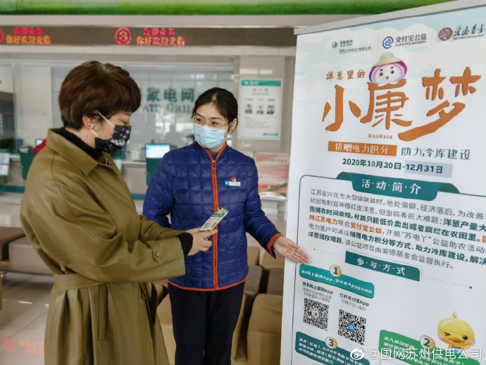 【匯聚點滴愛心 助力冷庫建設】12月4日,國網蘇州供電公司勞動路營業廳工作人員王玨向臨廳客戶介紹“洋蔥里的小康夢”積分公益活動,指導客戶在網上國網App通過游戲互動的方式,積攢“電離子”、捐贈“能量蛋”,為洋蔥儲存冷庫建設項目募集資金,助力泰州大營鎮聯鎮村村民脫貧增收。