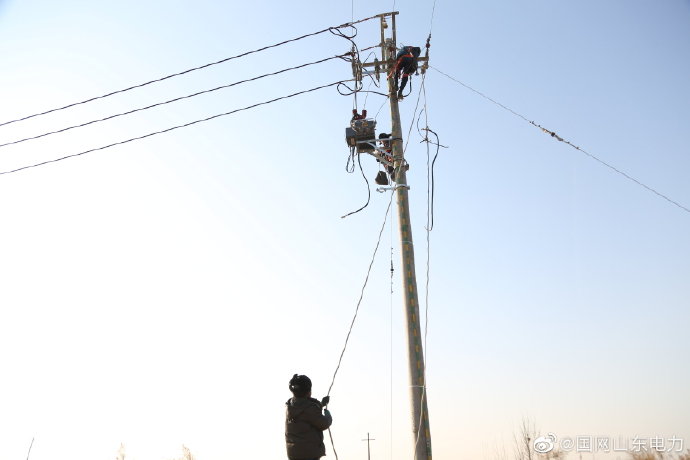 【在曠野的背景板上??電力人疾筆作畫】12月22日,國網昌樂縣供電公司組織施工人員對運行時長達20年的10千伏青倉線部分老舊線路設施進行改造施工,確保偏遠地區配網的供電安全。 ????