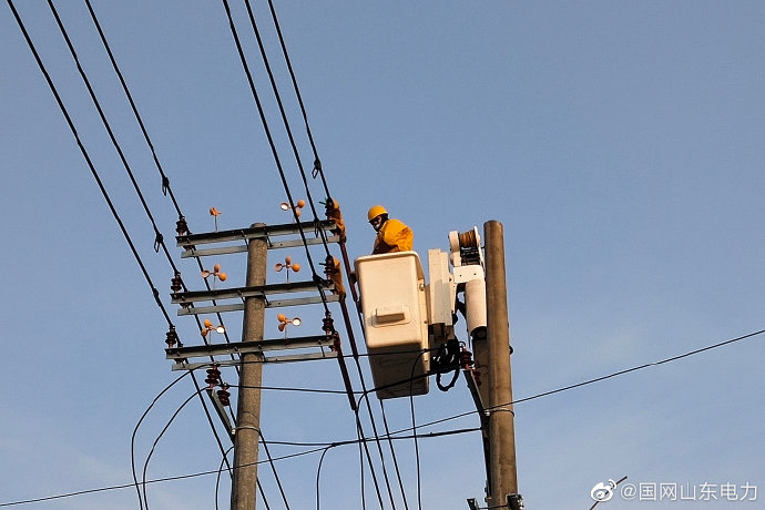 【帶電作業(yè) 保障寒冬供電穩(wěn)定】1月20日,國網(wǎng)利津縣供電公司帶電作業(yè)人員在10千伏前宋線42號桿帶電接引流導線,提升供電線路安全運行水平,保障寒冬日客戶安全可靠用電。