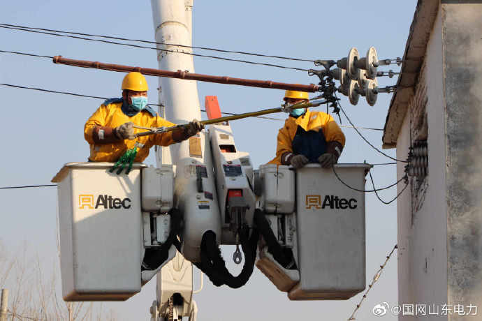 【帶電斷接引流線 消除缺陷保供電】2月3日,在10千伏梁西線十二廟支線49號桿下,國網禹城市供電公司?員工帶電斷接十二廟臺區的引流線,更換老化的跌落開關,確保臺區變壓器穩定運行,保障居民在春節期間放心用電。 ????