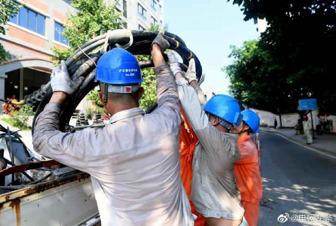 8月4日8時,烈日高照,重慶璧山區(qū)來鳳街道河壩街地表溫度高達(dá)45攝氏度。在10千伏四鹿線鹿來支線15-1號電桿,重慶璧山供電公司10余名員工冒高溫,將一臺250千伏安變壓器、兩根電桿、100余米高低壓電纜、配電箱等設(shè)施拆除。 ????