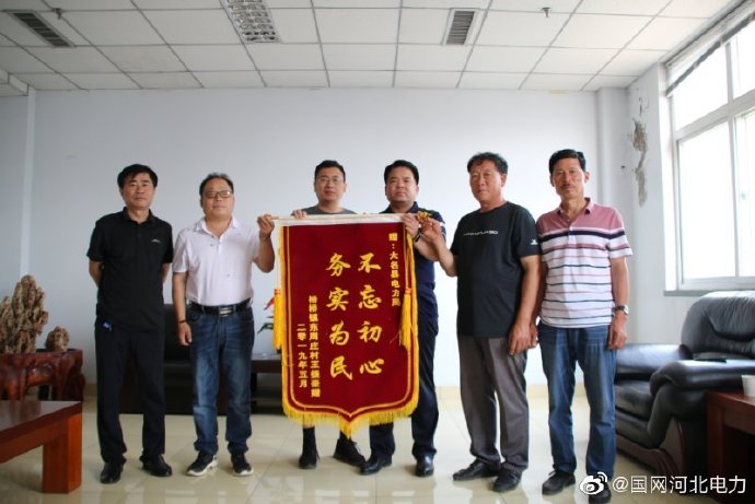 6月14日,大名縣楊橋鎮東周莊村村委會主任董元臣帶領王振豪等村名代表,專門來到國網大名縣供電公司,將一面繡有“不忘初心 務實為民”的錦旗送到該公司負責人手中,衷心感謝該公司解決了農排用電難題,為村民排灌創造了良好的條件。