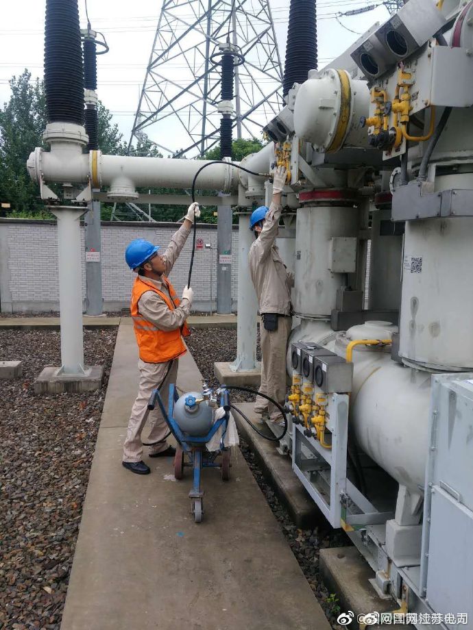 6月23日,國網(wǎng)江蘇檢修公司無錫運(yùn)維站修試人員在500千伏惠泉變對SF6氣壓偏低的GIS氣室進(jìn)行補(bǔ)氣工作。為確保供電設(shè)備在高溫高負(fù)荷下安全穩(wěn)定運(yùn)行,工作人員加強(qiáng)對所轄變電站的檢修巡視工作,及時(shí)發(fā)現(xiàn)并處理隱患,確保迎峰度夏工作順利開展。 ????