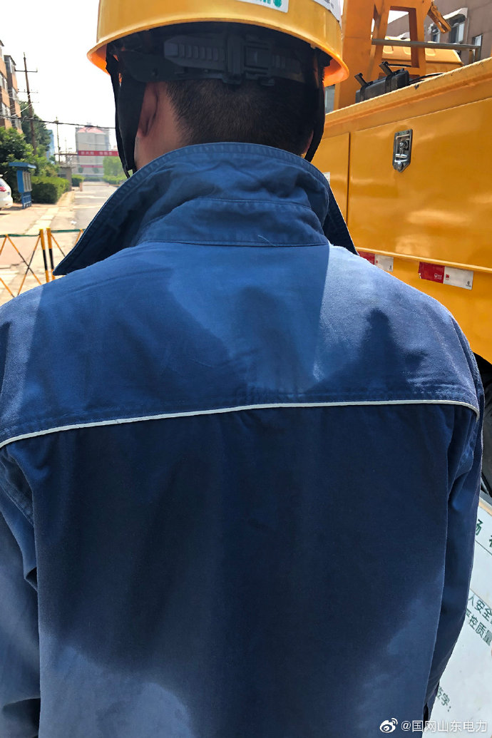 6月24日,氣溫34攝氏度,國網(wǎng)濱州供電公司帶電作業(yè)人員在10千伏渤五線雙峰石墨支線1號桿為某小區(qū)帶電接火。帶電作業(yè)人員在半空中工作近1小時才完成工作,當他們返回地面,脫下絕緣屏蔽服,汗水在他們的工裝上留下了一個“愛心”圖案。