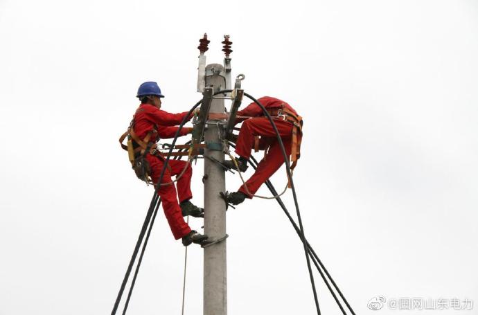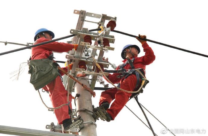 10千伏創(chuàng)業(yè)園國網(wǎng)利津縣供電公司工作人員登桿升級線路,供電安全穩(wěn)定