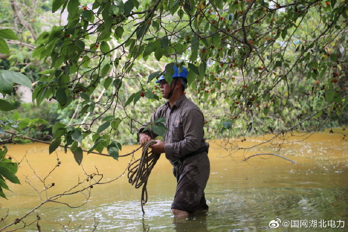 【趟水前進,只為小微企業用好電】7月19日,國網枝江市供電公司施工人員在問安鎮10千伏大竹園朱家灣4號臺區9號桿,為秦芳柑桔專業合作社進行10千伏配電工程施工。在施工過程中,施工人員面對橫在眼前的稻田、果林、房屋和堰塘,越田、跨屋、鉆樹叢。在堰塘旁邊,為防止電纜進水,他們更是用繩索系著電纜跳進水中,小心翼翼地保護電纜越過堰塘和塘邊的灌木叢,只為小微企業能用好電。