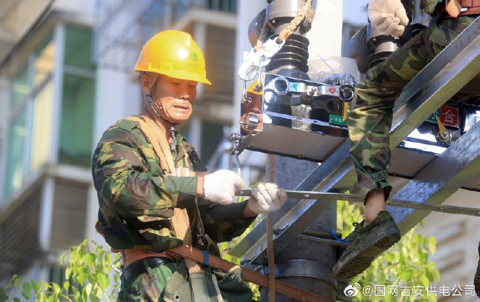 【酷暑日為客戶安裝專變臺區】7月24日,國網吉安供電公司員工在永豐縣恩江鎮聶家橋頭對憶鄉賓館專變臺區工程施工。