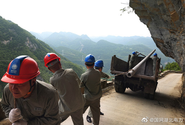 【電線桿過“關”記】8月1日,國網建始縣供電公司龍坪供電所員工在龍坪鄉野果寨村轉運網改物資材料。建始縣龍坪鄉野果寨村一處公路有近500米路段是在絕壁上開鑿而成,公路上方突兀伸出的絕壁與路面垂直距離僅3米左右,農用車拉著8米長水泥電桿無法通過,工人們只好徒手將電桿卸下,再用人力推車轉運到作業點。