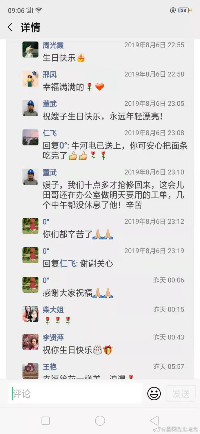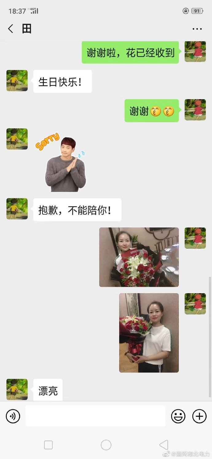【當妻子生日遭遇搶修】8月6日,國網丹江口市供電公司均州供電所員工胡菁收到一束嬌艷欲滴的玫瑰花,原來當天是她的生日!當她欣喜地感嘆老公“懂板”時,卻收到遠在牛河供電站丈夫田金安的道歉微信。當日,暴雨襲擊了整個丹江口市,在牛河供電站值班的丈夫正忙著搶修,無法趕回來給妻子過生日,只能簡單地在微信上告訴妻子。同為電力職工的胡菁不生氣,她明白,每一家的燈火通明,都有著電網職工的守護。
