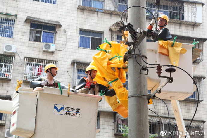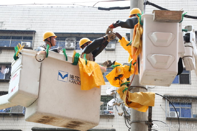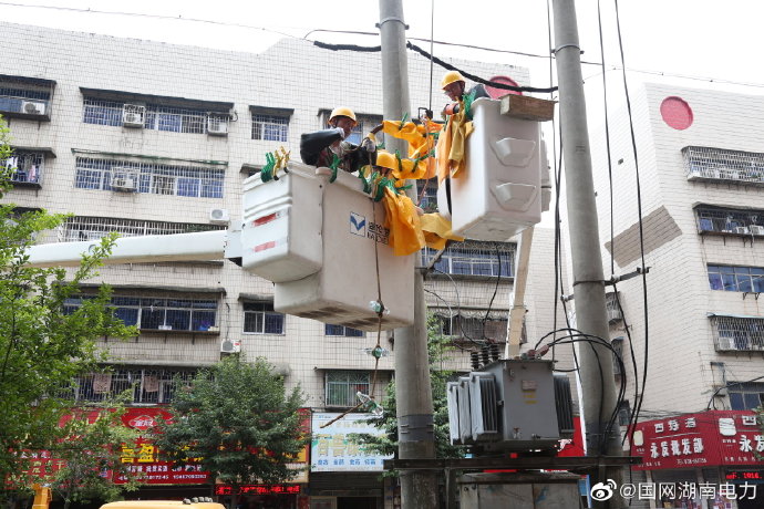 昨日上午11時許,婁星區供電支公司帶電作業工作人員正頂著烈日,穿著厚厚的絕緣服在婁底老街10千伏九沿線#095桿上帶負荷更換跌落保險,客戶用電沒有受到任何影響,受到了周邊商戶的一致好評。