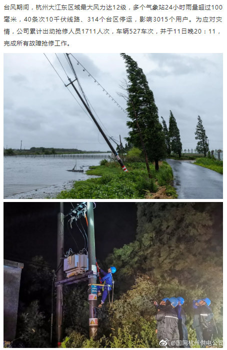 【值得珍藏!抗擊“利奇馬”的燃情時光】臺風期間,杭州大江東區域最大風力達12級,多個氣象站24小時雨量超過100毫米,40條次10千伏線路、314個臺區停運,影響3015個用戶。為應對災情,公司累計出動搶修人員1711人次,車輛527車次,并于11日晚20:11,完成所有故障搶修工作。