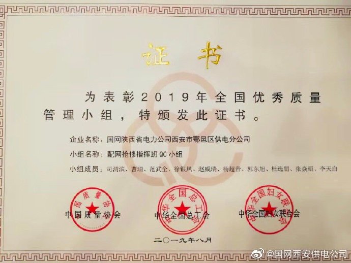 【鄠邑:全國優秀QC小組在省2019“質量月”活動啟動會成功展演】9月5日,國網西安市鄠邑區供電公司榮獲中國質量協會、中華全國總工會2019年全國優秀質量管理小組開展的《提高95598停電信息信息報送完整率》QC課題,在陜西省2019“質量月”活動啟動儀式暨質量提升推進會上進行展演。近兩年,鄠邑公司根據實際情況先后注冊了5個課題,所選課題都是針對基層班組安全運行、經營管理中存在的問題進行質量改進,使其真正起到解決實際問題,提高效益的作用。