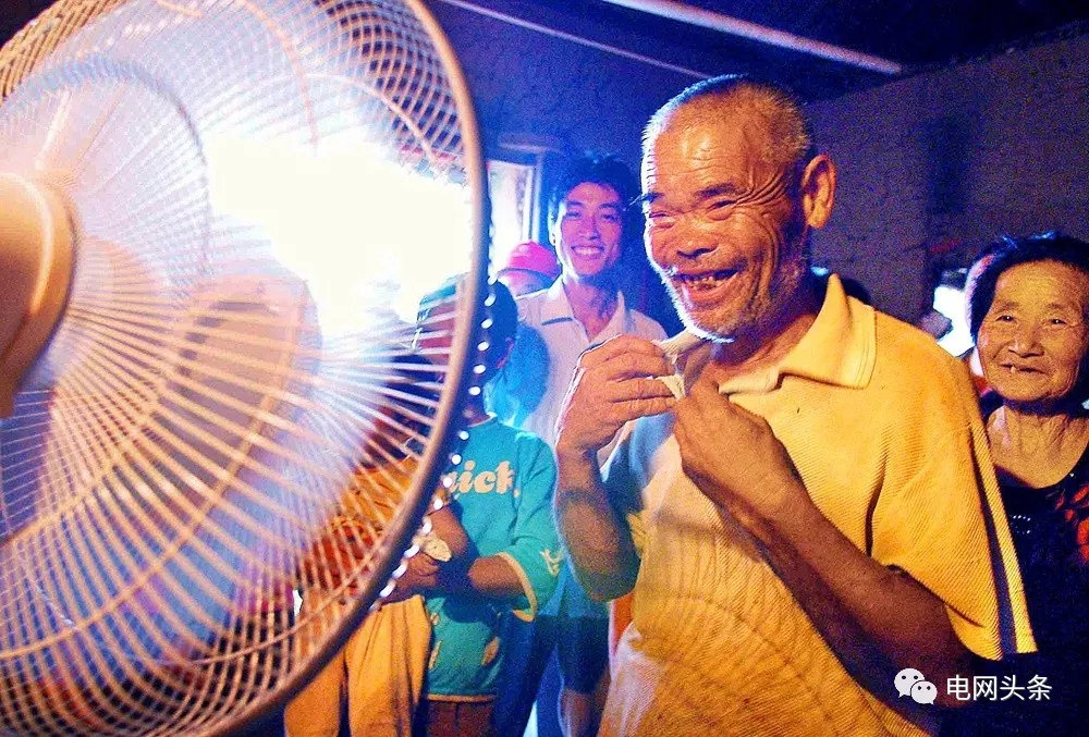 ▲2006年,安徽省實現戶戶通電。圖為滁州市通電客戶高興地吹起電風扇。